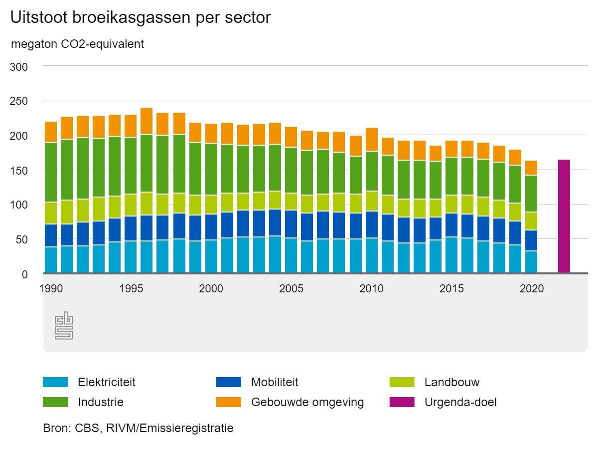 In 2020 was de uitstoot van broeikasgassen in Nederland 25,5 procent lager dan in 1990. De Urgenda-doelstelling - minimaal 25 procent minder uitstoot - is daarmee gehaald. De laatste vijf jaar is de uitstoot door kolencentrales met 80 procent verminderd. In het coronajaar 2020 was de uitstoot door wegverkeer 15 procent lager dan in 2019, meldt het CBS.