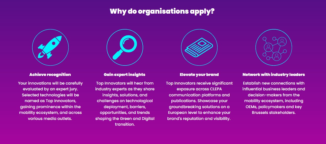 De CLEPA Innovation Awards erkennen en vieren met trots baanbrekende innovaties binnen de toeleveringsindustrie, die de groene en digitale transitie in Europa aandrijven. Alle spelers binnen het automotive-ecosysteem – van mkb’s en start-ups tot multinationale ondernemingen – worden uitgenodigd om hun innovaties te presenteren en erkenning te krijgen op Europees niveau.