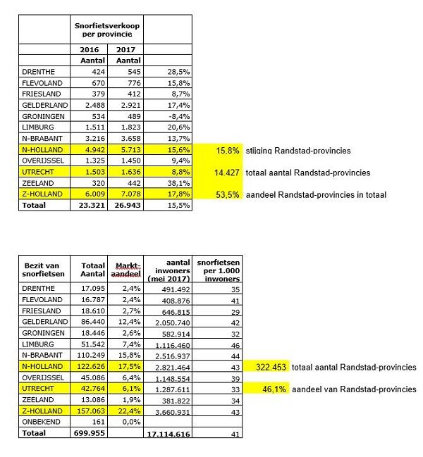 In de Randstad-provincies Utrecht, Noord- en Zuid-Holland werden tot en met juni 14.427 nieuwe snorfietsen verkocht en dat is 53,5 procent van het totale aantal in Nederland. In Utrecht nam de verkoop ten opzichte van de eerste 6 maanden van 2016 toe met 8,8 procent, in Noord-Holland conform het landelijke beeld met 15,6 procent en in Zuid-Holland zelfs met 17,8 procent. Intussen telt ons land 41 snorfietsen per 1.000 inwoners, met Limburg als koploper (46) en Friesland als hekkensluiter (29). Noord- en Zuid-Holland zitten met 43 per 1.000 net boven het gemiddelde, terwijl Utrecht er ruim onder zit (33) en per 1.000 inwoners zelfs minder snorfietsen telt dan Drenthe (35) en Zeeland (34).